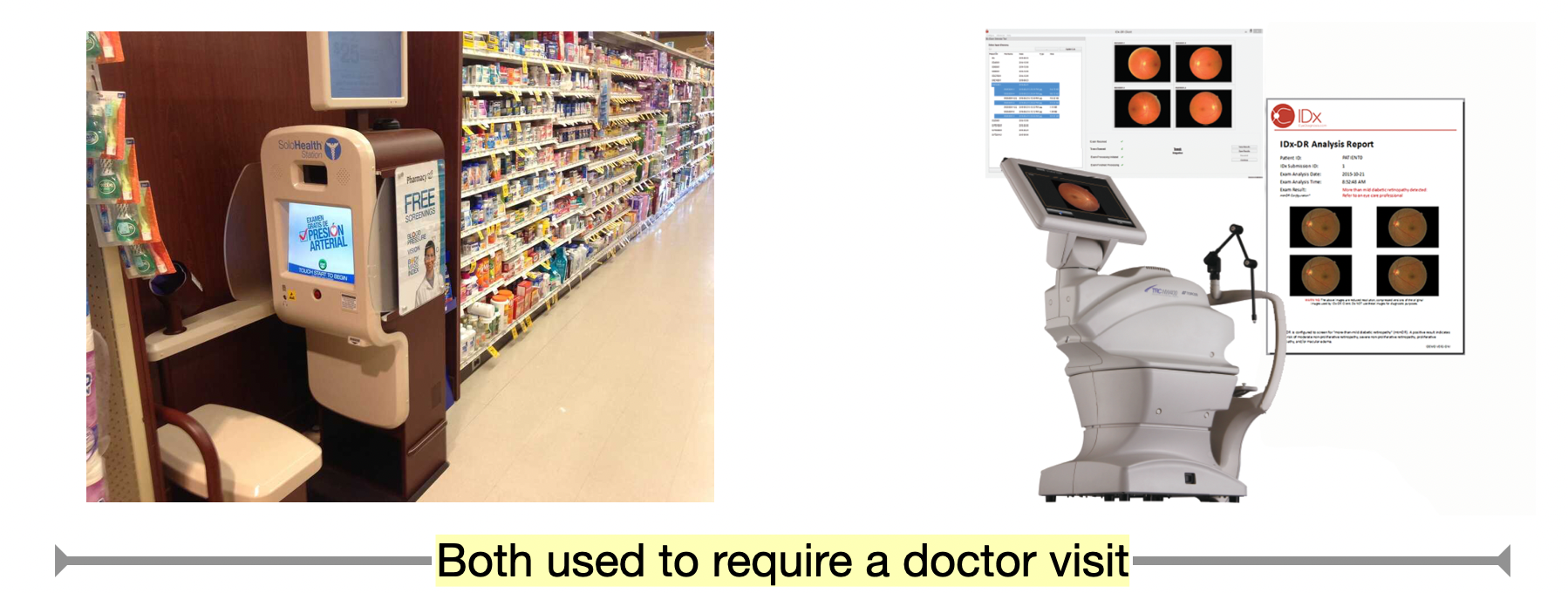 Even the in-healthcare examples I’ve provided in Part II, like IDx-DR (the AI system that diagnoses diabetic retinopathy without an ophthalmologist) are not likely to stay in-healthcare very long. Although for business (and regulatory) reasons that company is now marketing the product to primary care practices, there is no technological reason why that machine couldn’t be sitting right next to the automated blood pressure cuff in the drugstore.