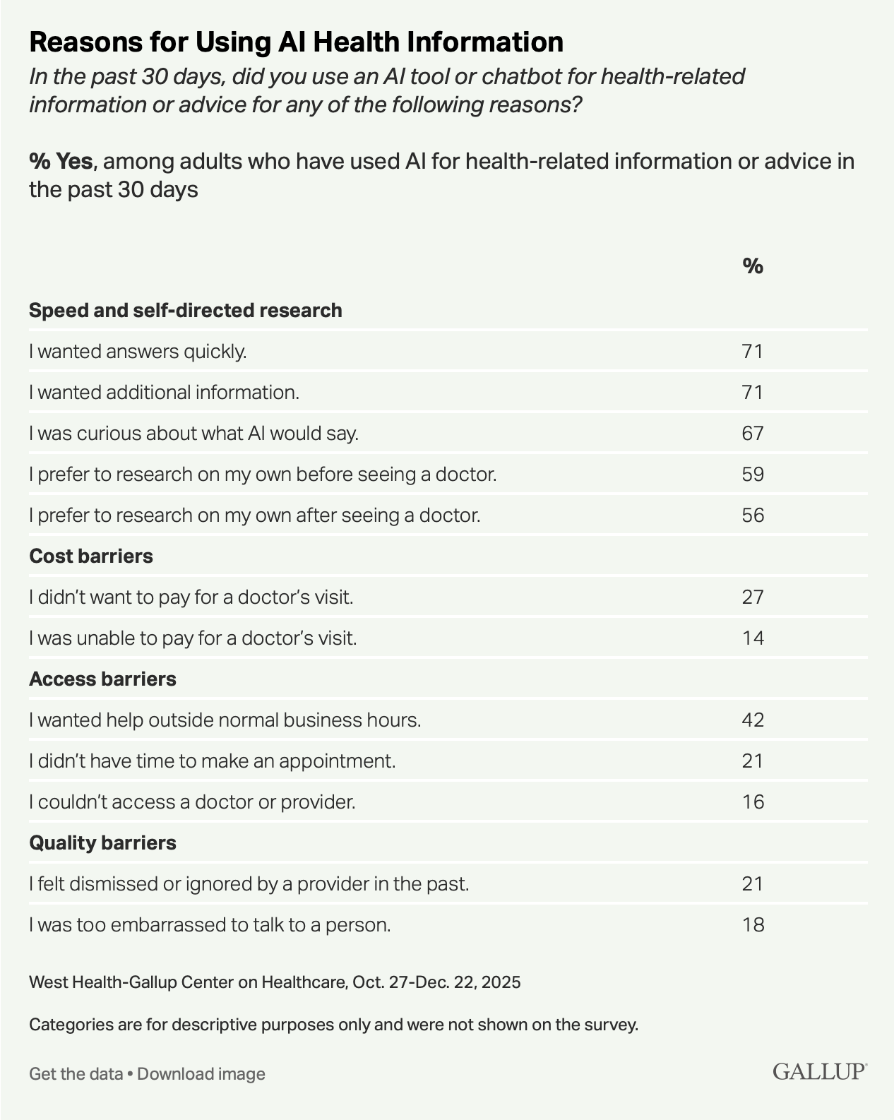 First, only 4% of AI users strongly trust the accuracy of the health information they're getting. The skipped visits aren't happening because patients believe AI is better than their doctor. They're happening because the alternative is worse: 14% of recent users cited inability to pay, 16% cited lack of access, and 21% cited feeling dismissed by a provider in the past. AI is filling a gap the delivery system created.